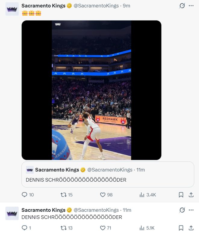 国王官方又为施罗德欢呼,还晒出施罗德三分准绝杀的视频为黑总戴上皇冠。