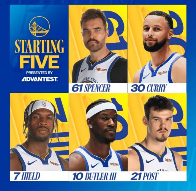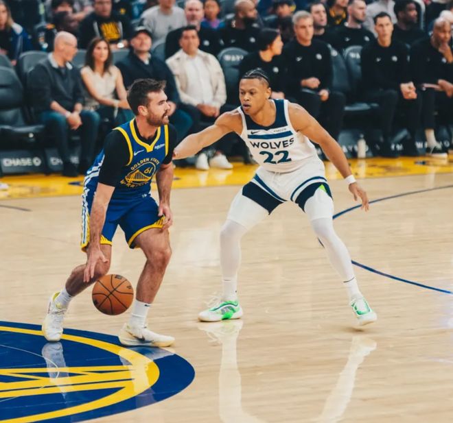 首发阵容方面,森林狼队这边,爱德华兹缺战,教练排出的首发五人组为:海兰德、迪温琴佐、麦克丹尼尔斯、兰德尔、戈贝尔;勇士队这边,库里伤愈复出,追梦格林和霍福德缺阵,首发阵容则为:斯潘塞、库里、吉米-巴特勒 、希尔德、昆滕-波斯特。